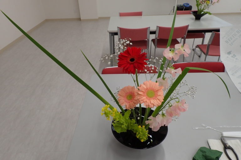 生け花を実際におこなうのは初めての人ばかりでしたが、真剣な表情で思い思いに取り組む姿があちこちで見られました。