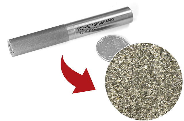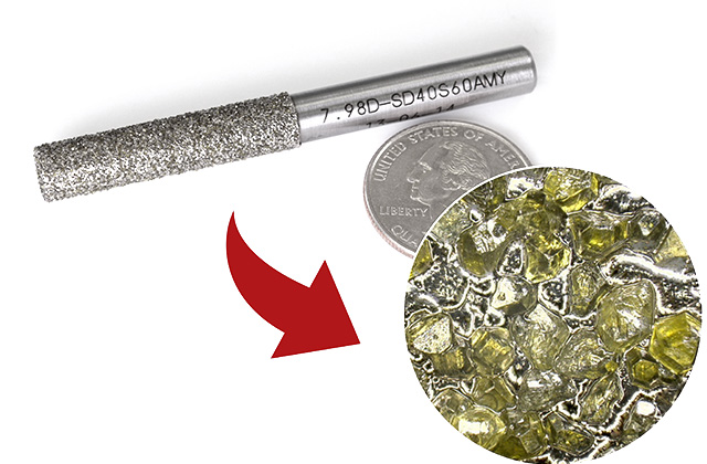 ハンマーには大小があります。また、形状も平らなものや先が尖ったものがあり、力強く打ちたい時は大きく平らなハンマーを、正確に打ちたい時は小さく先の尖ったハンマーを使います。ダイヤモンド砥石も同様です。ダイヤモンド砥粒にも大小(番手で区分けしています)があります。形状も、寿命が長持ちする角が鈍角のものや、切れ味重視の尖ったものがあります。効率が必要な荒加工にはカケにくい形の大きなダイヤ粒子を使い、精密な加工には先の尖った切れ味の良い小さな砥粒を選定します。